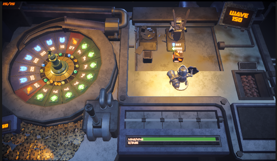 You play as a small figurine hero fighting through a mechanical tabletop dungeon. Each turn, the wheel decides what you get, attack, defense, gold, healing. Battle through encounters and see how long you can last.